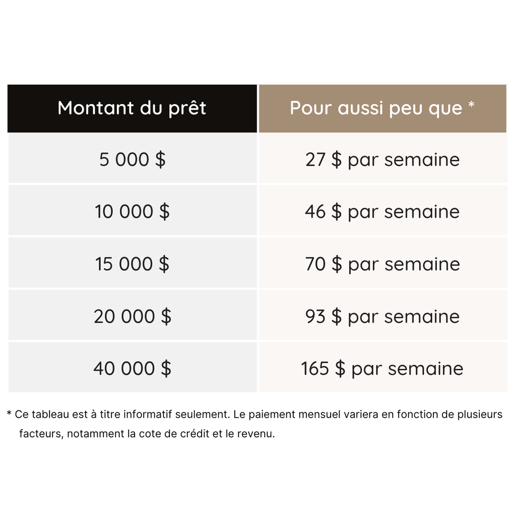 Les montants de prêt commencent à partir de 500$ et peuvent aller jusqu'à 40 000$.